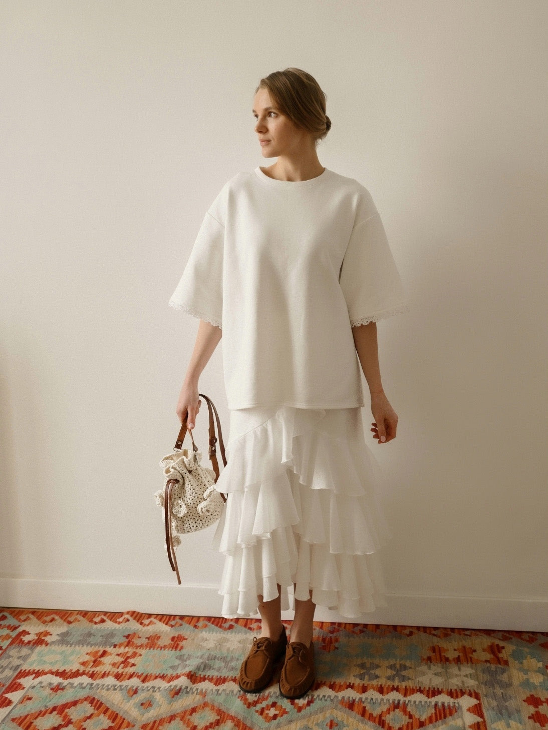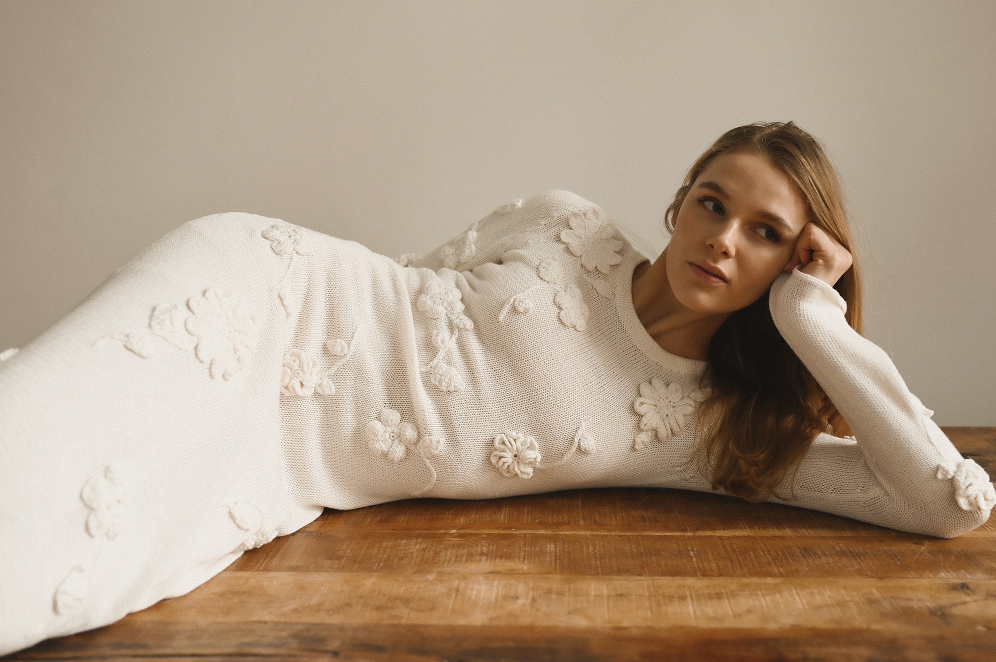Легкі костюми з натуральних тканин — льону та віскози — для свободи рухів. Жіночна силуетна сукня, прикрашена вручну в’язаними квітами, як нагадування про тендітність і чарівність моменту. М’які жилети та кардигани, ідеальні для мінливої погоди, вечірніх прогулянок та подорожей. Ручне в’язання в аксесуарах — тепло рук майстринь, яке завжди з вами.