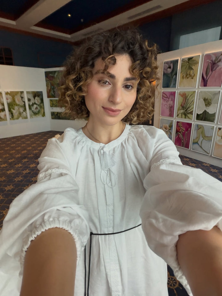The linen dress is made in a beige and white colors. This fabric is very soft, pleasant to the body and lightweight. Crocheted elements along the dress are handmade. This model is presented in one size, makes feminine and relaxed silhouette. We recommend you to combine it with mineral and chrysolite necklaces and rings or pendant Berehynia.