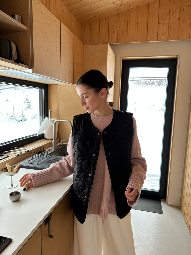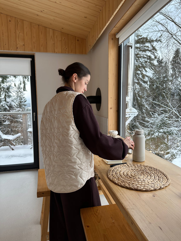 У комплекті є мішечок для зберігання. У ньому зручно брати жилетку з собою — у сумку, у подорож або на випадок, якщо протягом дня стане прохолодніше.